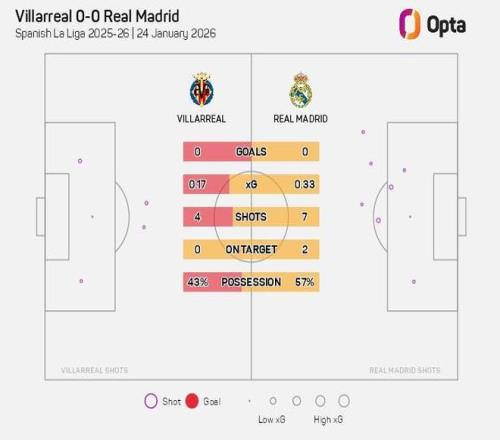 此役客场对阵比利亚雷亚尔,皇家马德里完成7次射门,2次射正,而对手完成4次射门,无一射正。
